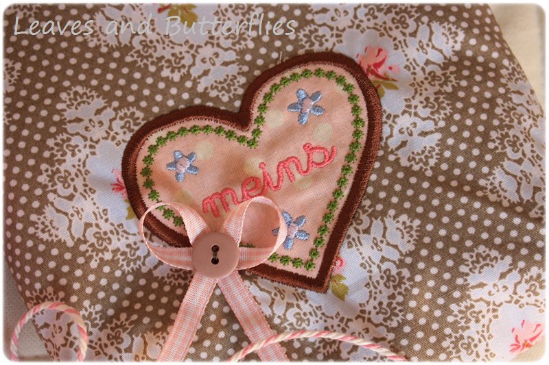 Zusammen mit meiner lieben Sticki, schönen Stickmustern und bezaubernden Stöffchen sind herrliche alpenschöne Täschchen entstanden, an denen ich mich gar nicht statt sehen kann. Heute zeige ich euch einen Kosmetikbeutel den ich bereits vor einigen Tagen verschenkt habe. Auf dem Täschchen ist eine Applikation in Form eines Herzens. Schön bestickt mit dem Wörtchen "meins" kann sie nun für diverse Kosmetika benutzt werden. Der äußere Stoff ist schön gemustert und der Innenstoff altrosa mit dezenten Punkten. Wunderschön passt dazu die rosa-weiße Kordel von Krima und Isa. Ein Schleifchen darf wie immer auch nicht fehlen...