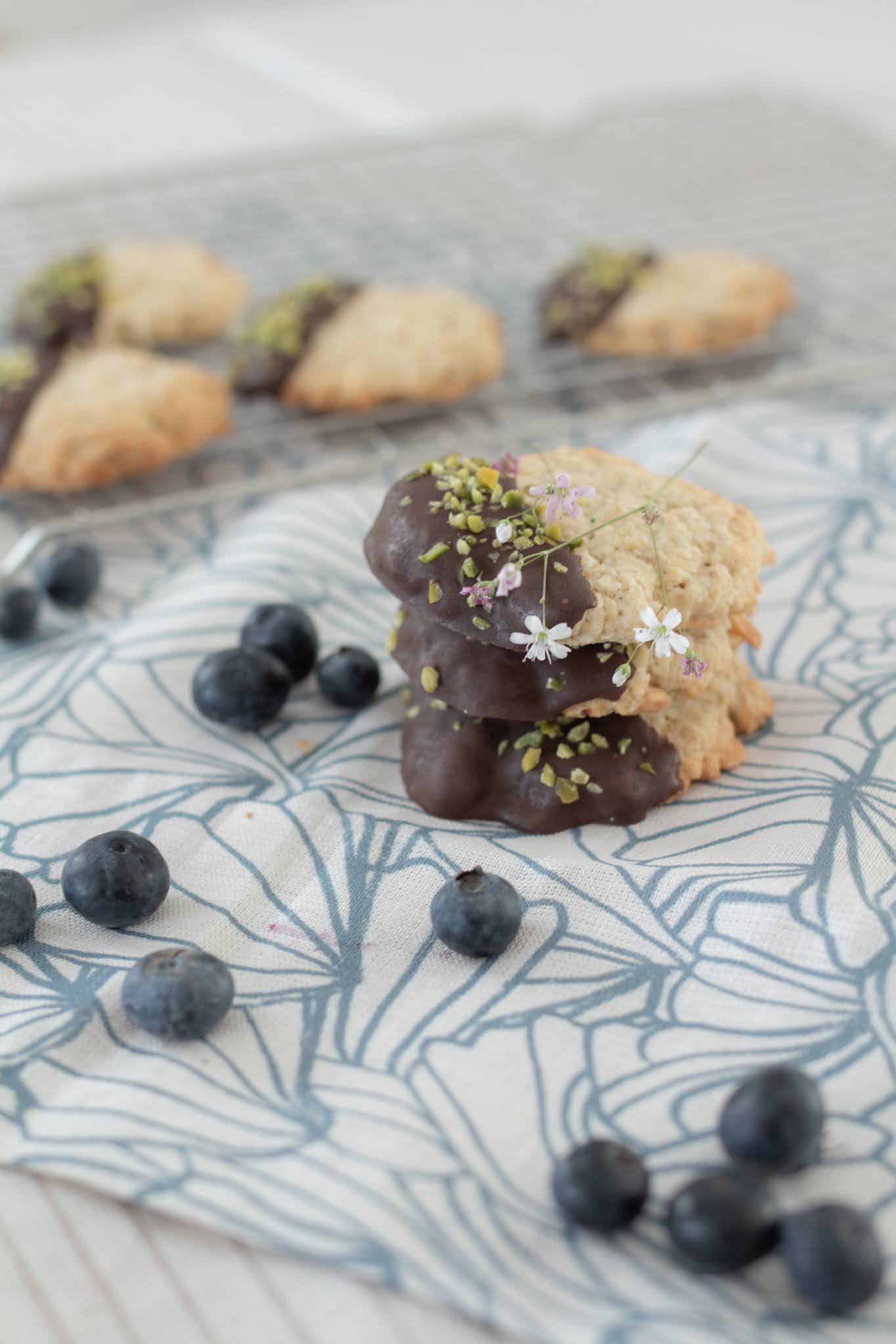 In der Zwischenzeit die Kuvertüre im Wasserbad schmelzen. Die abgekühlten Haferkekse mit einer Hälfte in die Schokolade tauchen und sofort mit den gehackten Pistazien bestreuen.